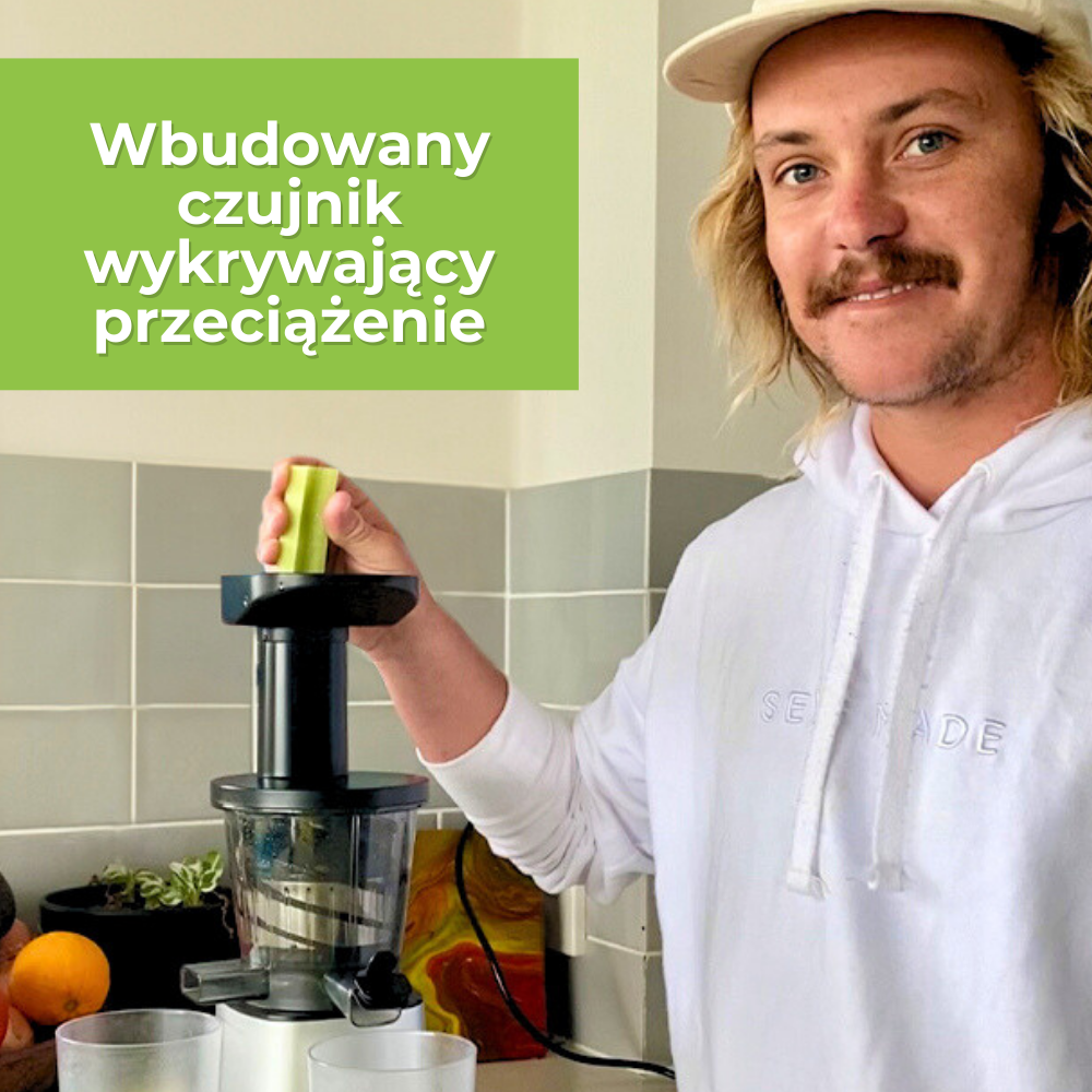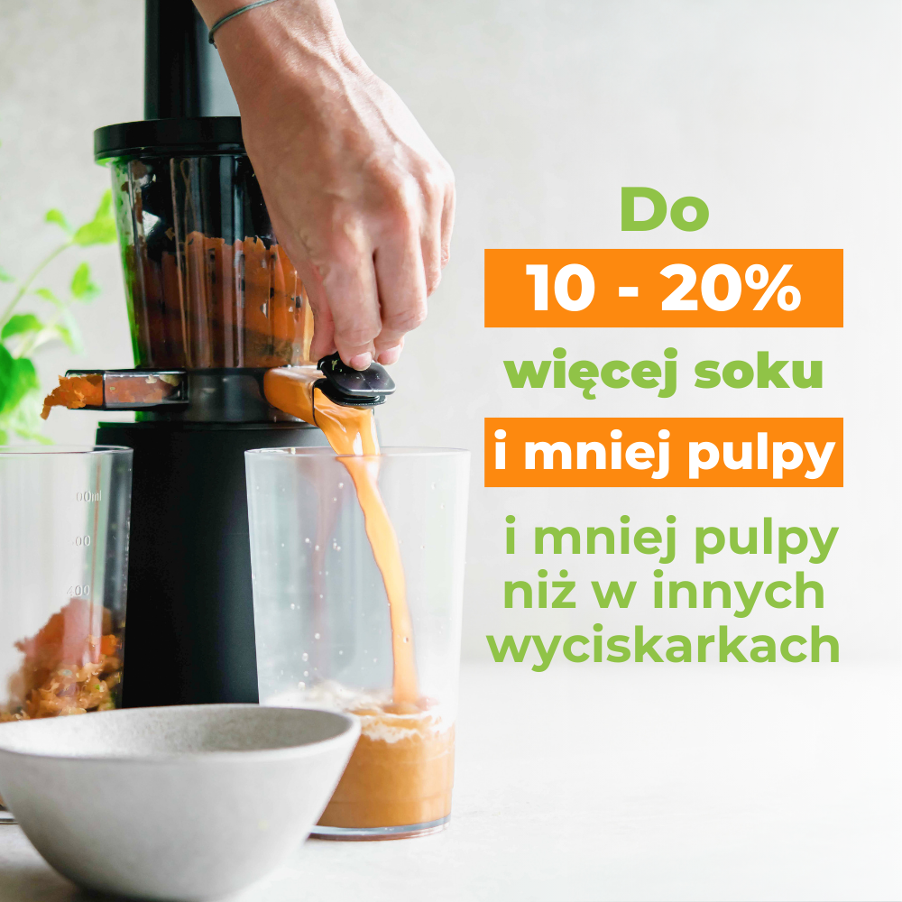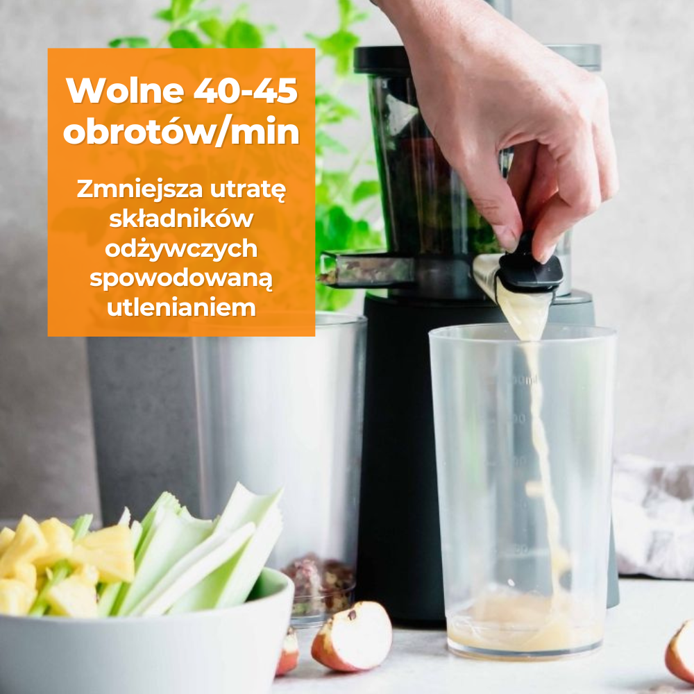 ZWIĘKSZ SWÓJ SOK: Niska prędkość obrotowa 40-45 obr./min dla maksymalnego zachowania składników odżywczych + 10% - 20% więcej soku i mniej miąższu niż w innych wyciskarkach